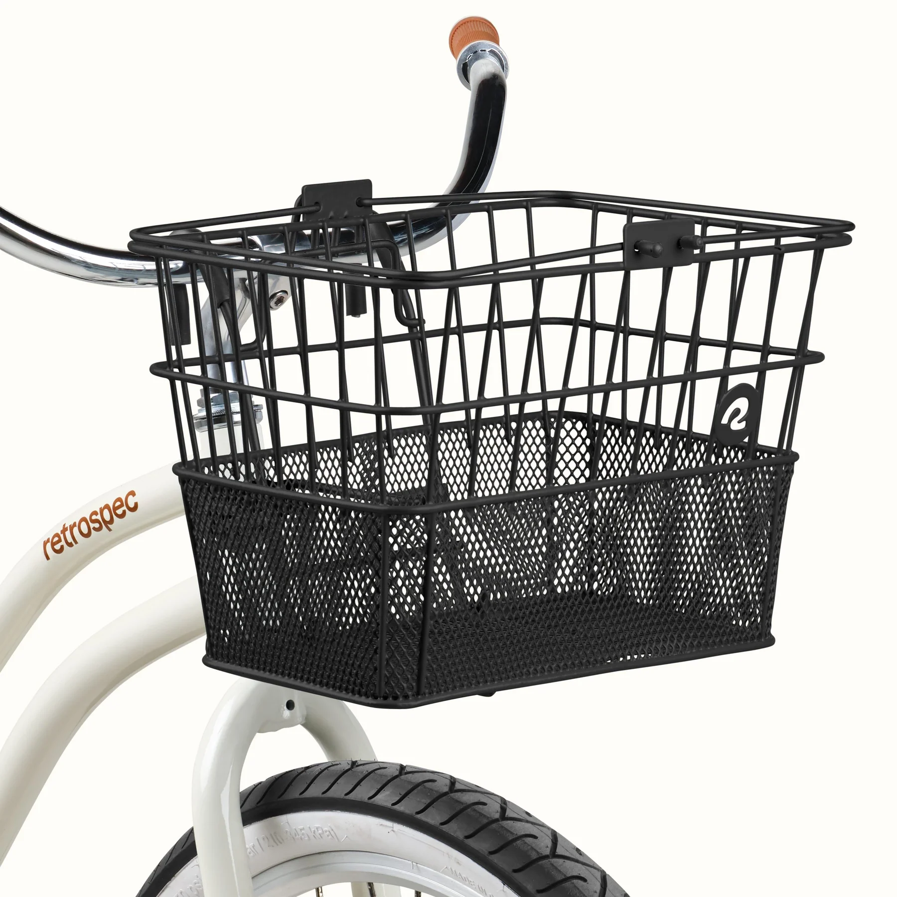 The Retrospec Apollo Steel Bike Basket is a durable, weather-resistant front basket designed for everyday errands, featuring a tool-free installation process and integrated handles that allow it to be used as a portable tote. Black White Silver or Blush