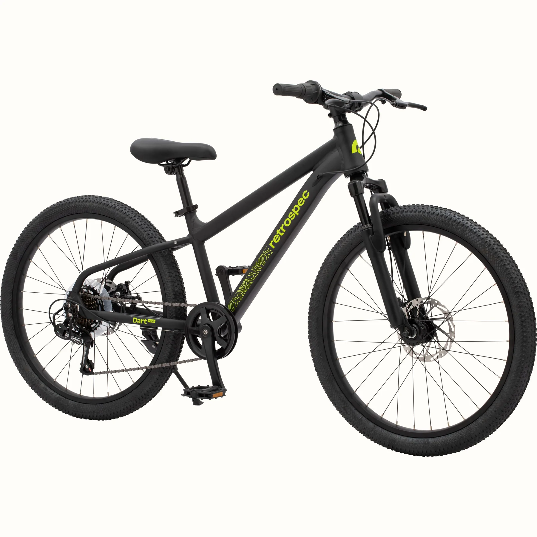 The Retrospec Dart Plus 24" Kids Bicycle has an aluminum alloy frame and a front suspension fork with 50mm travel. The drivetrain is a Shimano Tourney 7-speed system with twist shifters, and it uses hand-operated mechanical disc brakes. The bike has 24" wheels with wide 24 x 2.30" tires. The seat height can be adjusted from 26" to 32.5"